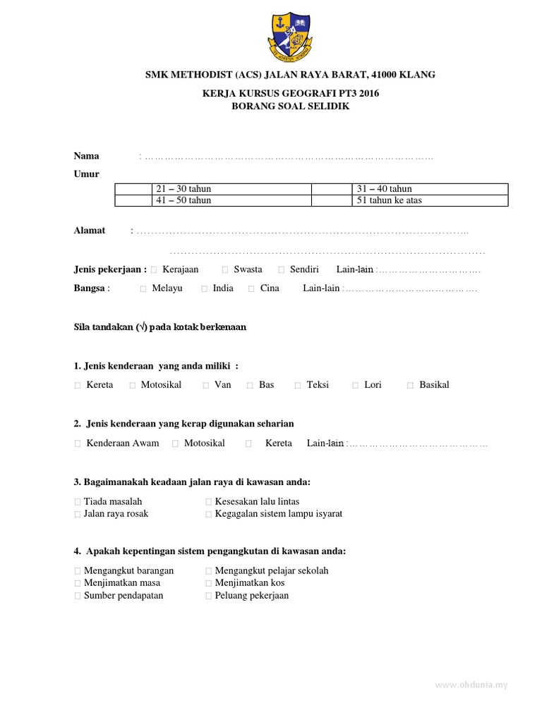 Konsep pencemaran alam sekitar. Pada tarikh dan masa yang ditetapkan pengkaji mengedarkan borang soal selidik kepada pelajar untuk. Berikut adalah Borang Soal Selidik Sistem Pengangkutan PT3 yang dapat dijadikan panduan dan rujukan kepada pelajar semua menyiapkan Kerja Kursus Folio Geografi PT3 2016.
